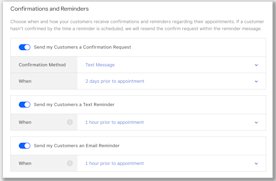 Specify when and how your customers receive reminder and confirmation messages regarding their appointments. You can automatically send your customers a text and/or email to confirm and remind them of their appointment ahead of time, avoiding no-shows.