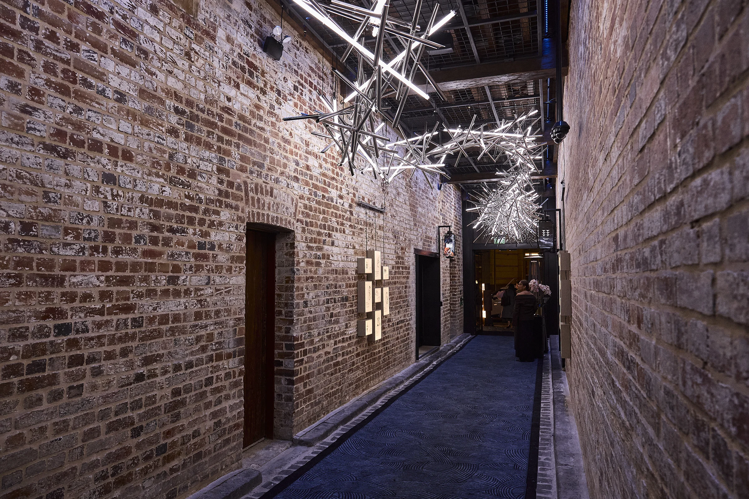 Sydney’s CBD is a blur of traffic, flashing signs and construction noise, but entering 230 Sussex Street feels like stepping through a portal. Stretching overhead is a dazzling cluster of fluorescent-lit glass tubes, throwing fractured light down old brick walls. The hum of chatter mingles with the aroma of smoke from a grill. Digital lantern lights in the hallway lead to an expansive courtyard, where a wall display illuminates shelves of whiskies.
