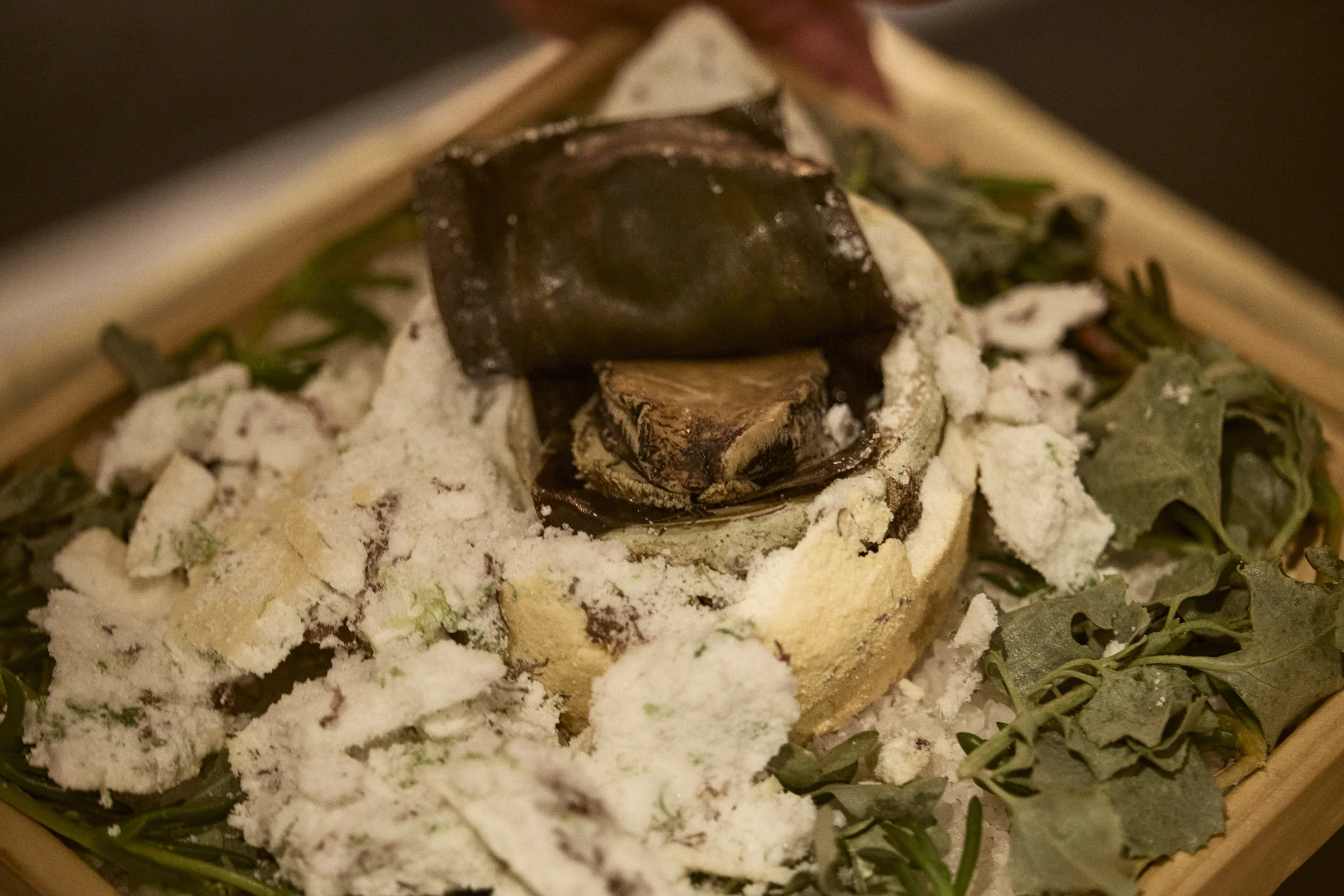 For one of my signature dishes, the abalone dish, we cook it the traditional Japanese way in dashi and sake, then wrap it in kombu and bake it with salt. I show customers the salted baked abalone. First, they smell it. They touch the seaweed. Then, for the presentation, I break down all the salted crust in front of the customers. And at the end, they taste it. That stimulates their five senses in one dish.So, I’m not only cooking and creating dishes, I’m also a performer. Customers enjoy this show or performance from the open kitchen. Some customers jump up to the pass to watch how the chefs plate up. Some take a picture or a video while we are performing.