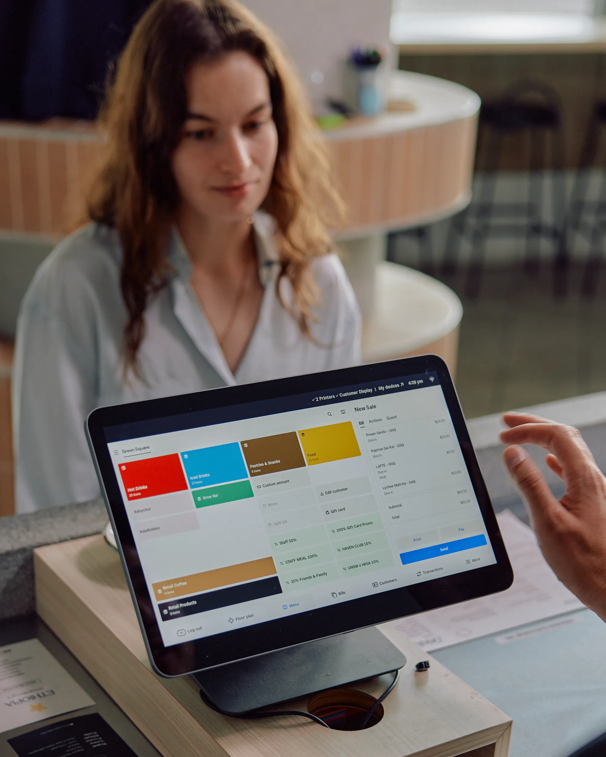 Front-of-house staff use Square for Restaurants to take orders and payments efficiently. Table service orders are entered on an iPad, and takeaway orders are handled at the counter using Square Register. Tableside payments are taken quickly with Square Terminal, while Square Reader adds extra flexibility for pop-ups, workshops, their coffee cart or simply as a backup when needed.