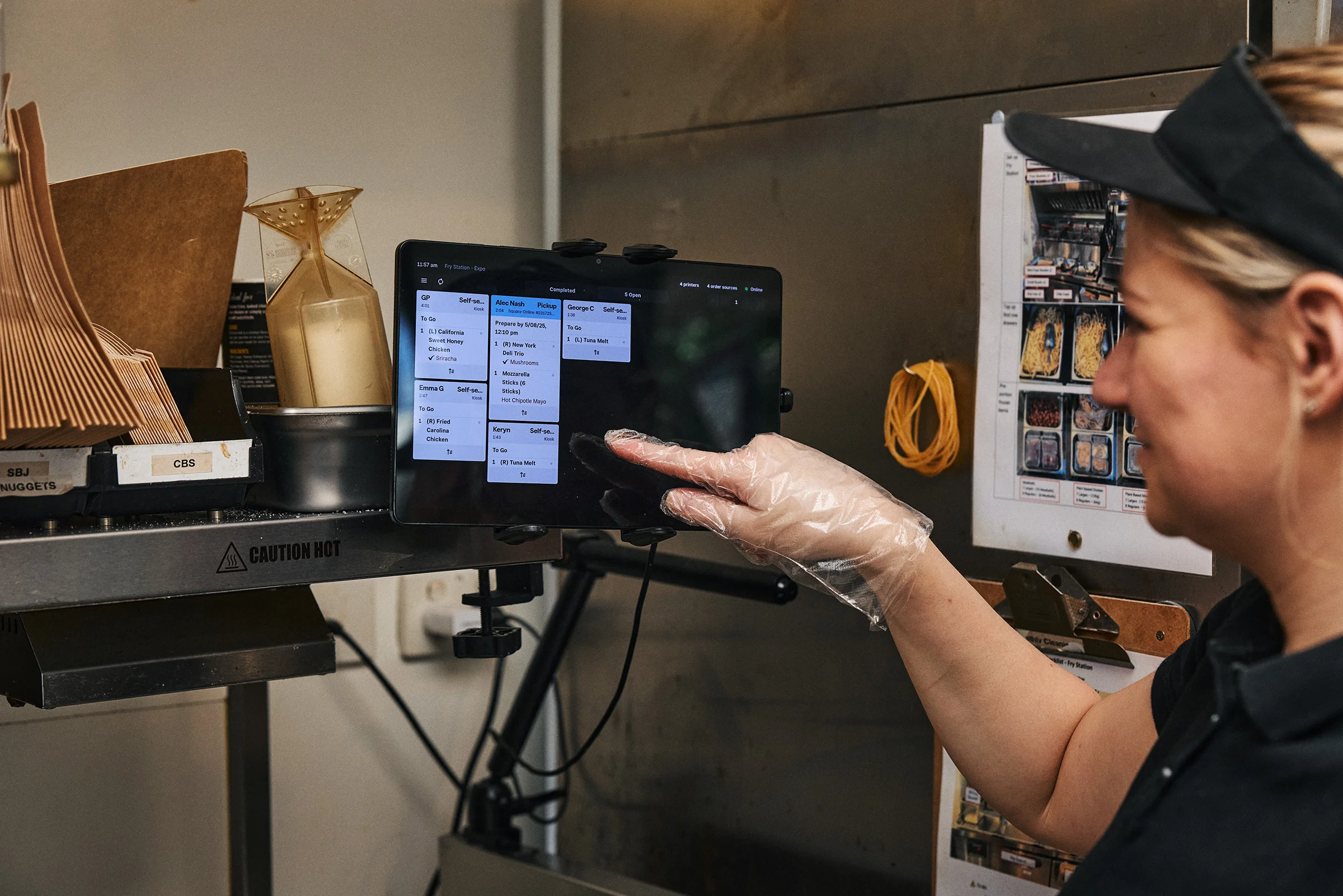 All in-store and online orders automatically route through to Square KDS (kitchen display systems), which the team rely on to make the sandwiches. Screens are set up at key stations: one by the fryers and two along the sandwich line. Since every sandwich goes through a conveyor oven, paper tickets aren’t an option – they’d burn. Instead, the digital screens show real-time orders, which keeps things organised and in sync across the area.