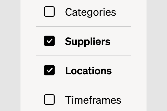Configure reports to fit your business using filters for suppliers, time frames, categories and more.