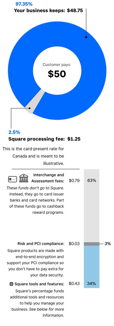 Merchants in Canada pay billions of dollars every year in interchange and assessment fees for electronic payments. A large portion of these fees go to the banks toward paying cash back and other rewards programs for their card members. At Square, we have an entire team that works on sellers’ behalf to negotiate with card networks and industry partners to keep rates as low as possible for our sellers.