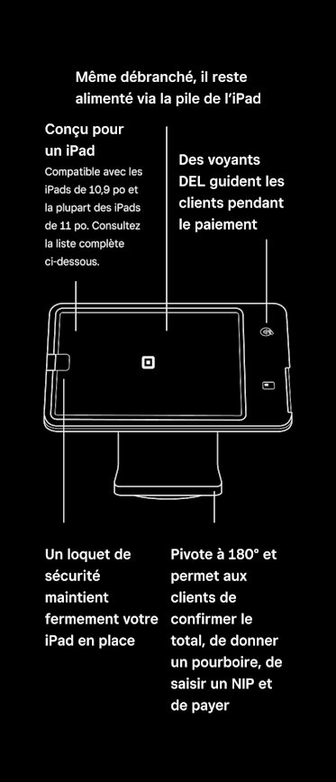 Pivote à 180° et permet aux clients de confirmer le total, de donner un pourboire, de saisir un NIP et de payer