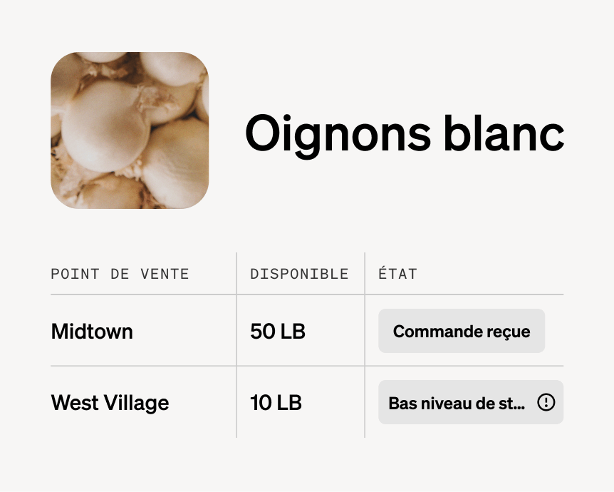 Surveillez les niveaux de stock dans tous les points de vente. Les mises à jour se font automatiquement au fur et à mesure que les articles sont utilisés ou reçus.
