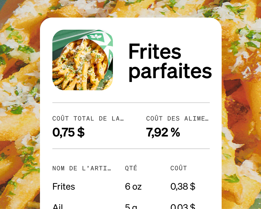 Consultez les marges bénéficiaires exactes pour chaque plat afin de prendre des décisions plus judicieuses en matière de tarification.