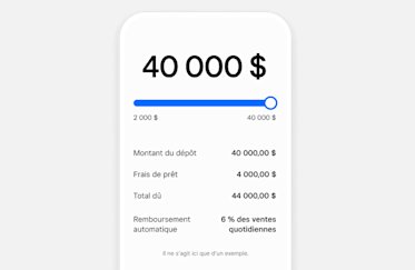 L’admissibilité au prêt est basée sur une variété de facteurs liés à votre entreprise. Vous devez être en activité depuis au moins un an, réaliser 250 000 $ ou plus de ventes par carte par point de vente et avoir un historique de rétrofacturation minimal avec votre processeur de paiement actuel. Nous examinons également les trois mois de vos plus récents relevés de traitement pour déterminer le montant auquel votre entreprise est admissible. Une fois que vous avez présenté votre demande de prêt et que vous avez traité des paiements avec Square pendant au moins cinq jours, vous recevez l’argent dès le jour ouvrable suivant si votre demande est acceptée. Tous les prêts sont soumis à l’approbation du crédit; l’admissibilité n’est pas garantie.