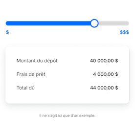 Vous payez des frais uniques pour contracter le prêt (nous les appelons frais de prêt). Ces frais ne changent jamais et sont remboursés pendant toute la durée du prêt. Pas de frais de retard, d’intérêt permanent, ni de surprises.