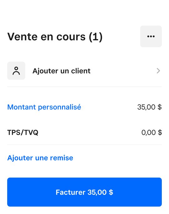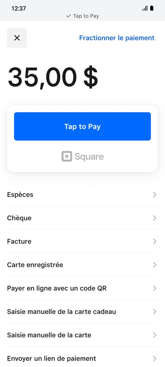 Au Canada, Paiement rapide est compatible avec les cartes de crédit sans contact telles que Visa, Mastercard, American Express et Discover, ainsi qu’avec les cartes de débit, Apple Pay, Google Pay et d’autres portefeuilles numériques. Si votre client ne dispose pas d’un mode de paiement sans contact, vous pouvez également accepter des paiements par saisie manuelle de carte, par code QR ou par lien de paiement dans l’application Solution PDV Square.