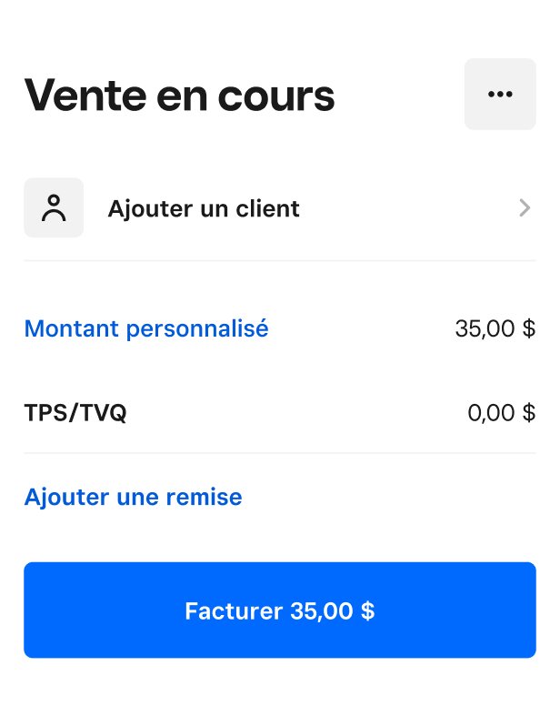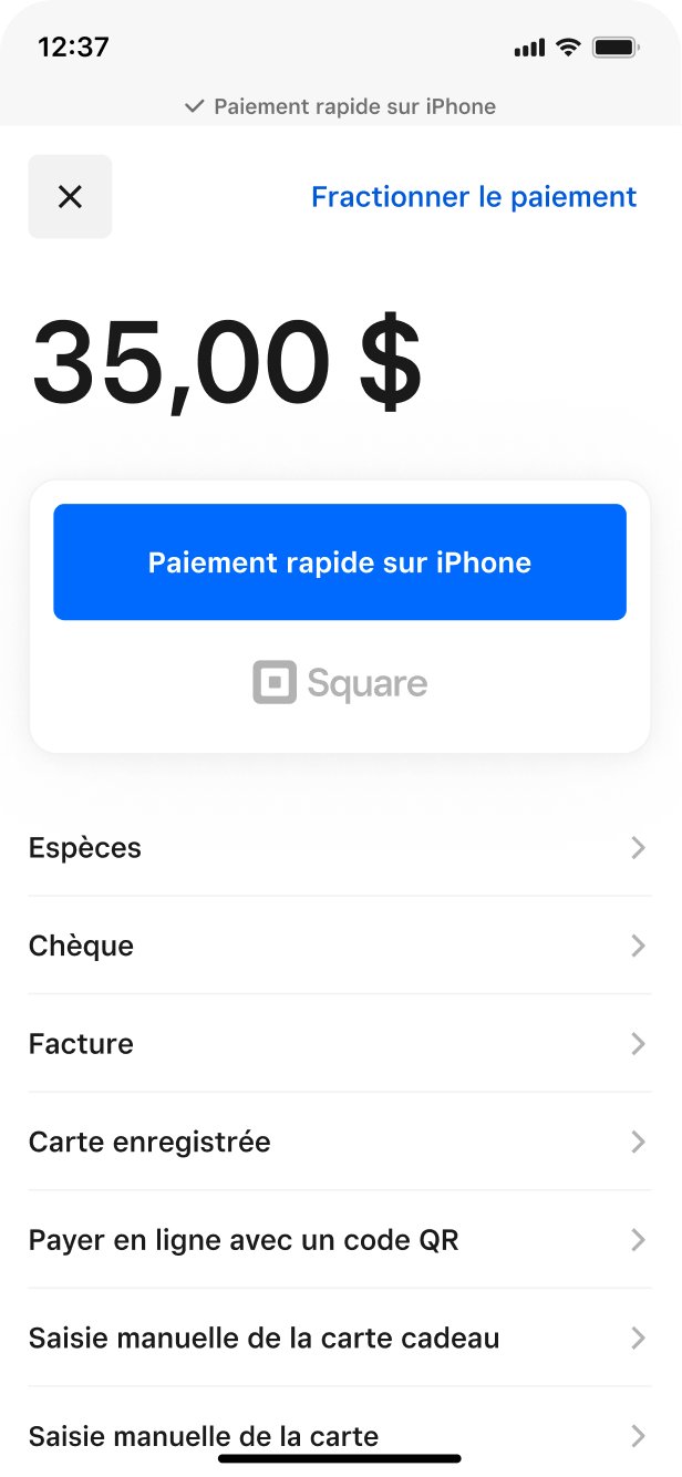 Au Canada, Paiement rapide sur iPhone est compatible avec les cartes de crédit et de débit sans contact, comme Visa, Mastercard, American Express, Discover et Interac, ainsi qu’avec Apple Pay, Google Pay et d’autres portefeuilles numériques. Si le client ne dispose pas d’un mode de paiement sans contact, vous pouvez aussi accepter des paiements par saisie manuelle de carte, par code QR ou par lien de paiement dans l’application Solution PDV Square.