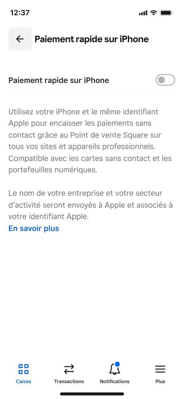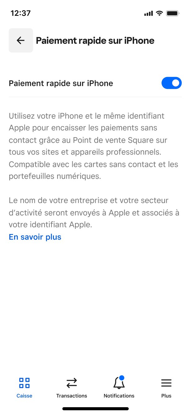 Après avoir téléchargé l’application Solution PDV Square, vous serez invité à vous connecter avec votre identifiant Apple. Dès que c’est fait, vous pourrez accepter des paiements sans contact avec Paiement rapide sur iPhone.