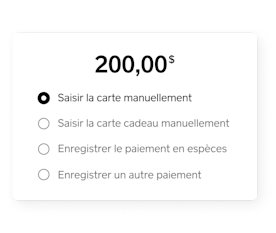 Laissez les clients passer leurs cartes de crédit ou de débit sur le lecteur, insérer une carte à puce et NIP ou payer avec Apple Pay et Google Pay. Encaissez l’argent comptant, les chèques, les Cartes cadeaux Square et d’autres paiements avec votre ordinateur.