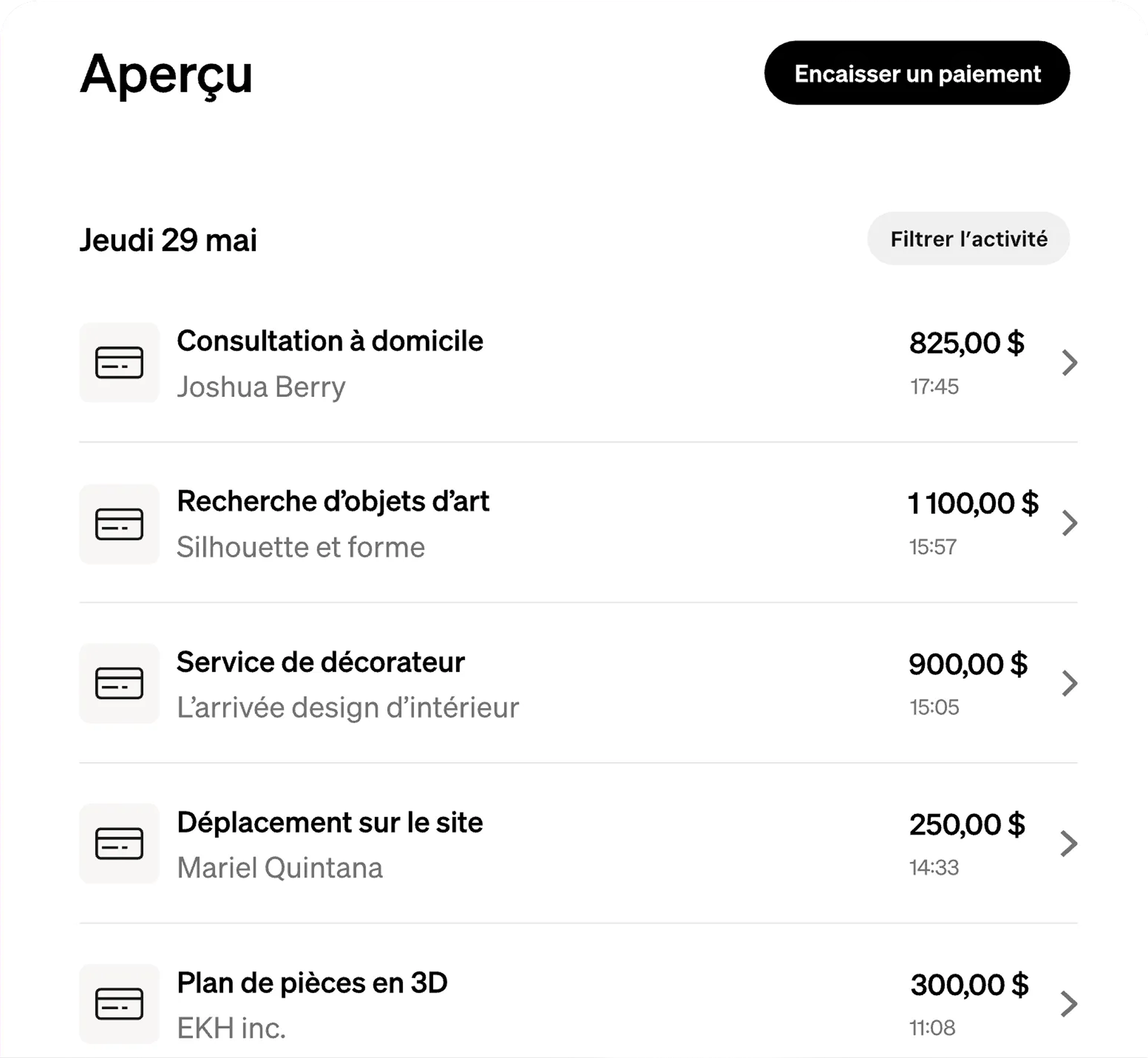 Vous pouvez accepter les cartes de crédit et de débit ou facturer une carte enregistrée.
