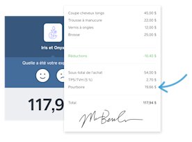 Vos clients peuvent signer sur un ticket de caisse imprimé ou directement sur votre appareil et choisir un pourboire prédéfini en devise ou en pourcentage : plus facile pour eux, plus efficace pour vous.