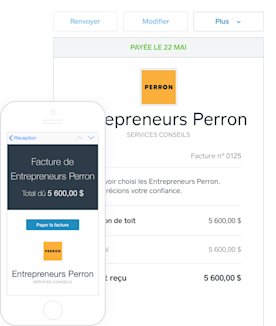 Apportez la touche finale aux projets réalisés en utilisant les Factures Square. Il vous suffit d’accéder à votre Tableau de bord Square et d’envoyer gratuitement vos factures, le tout pour seulement 2,8 % + 0,30 $ par facture réglée. Vos clients paient en toute sécurité directement depuis le courriel de facturation et votre argent est déposé dans votre compte le jour ouvrable suivant.