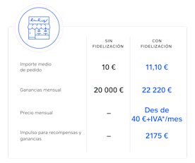 El coste mensual parte de los 40 € + IVA*/mes y varía en función del total de visitas de clientes del programa de fidelización que recibas por punto de venta al mes.