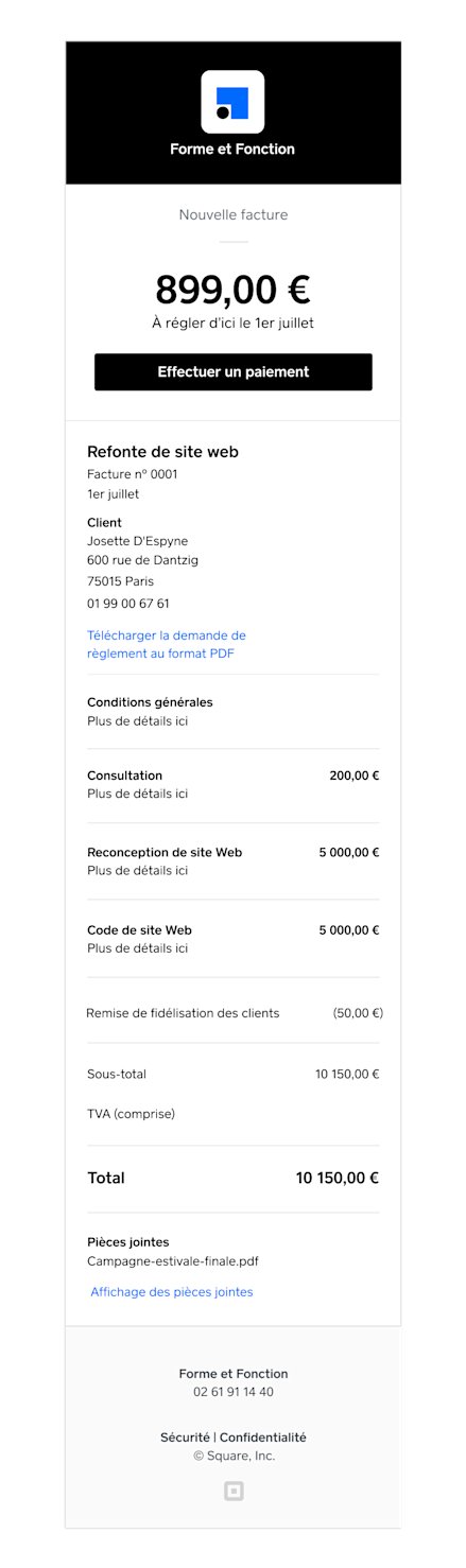 Envoyez des factures numériques par e-mail, SMS ou en partageant manuellement un lien. Vos clients peuvent payer en ligne avec une carte de bancaire, Apple Pay, Google Pay ou une carte cadeau Square.