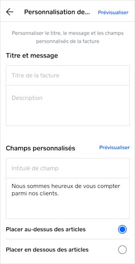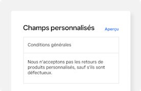 Créez des champs de facture personnalisés et choisissez-en l’emplacement pour fournir des détails supplémentaires à vos clients, notamment vos conditions d’utilisation, d’annulation, votre politique de retour ou tout autre message personnalisé.