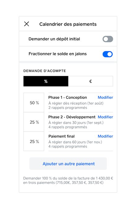 Acceptez les paiements 24 h/24, 7 j/7 et laissez vos clients payer en un seul clic grâce à un logiciel de facturation intelligent.