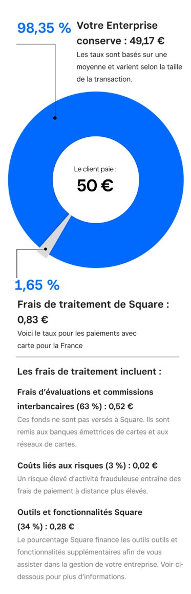 Il est important de nous montrer totalement transparents sur la répartition de nos frais relatifs aux transactions. Lorsqu’un client dépense de l’argent dans votre entreprise, Square ne conserve qu’une fraction des frais prélevés. Ces frais sont ensuite réinjectés dans des outils et des fonctionnalités pour votre entreprise.