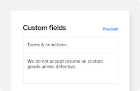 Create and select the placement of custom invoice fields to provide additional details to your customers, including your terms of service, cancellation policy, return policy or any other personalised message.