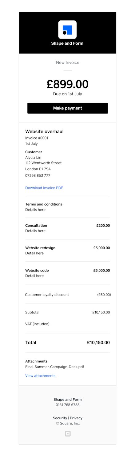 Send digital invoices via email, SMS or by manually sharing a link. Your customers can pay online with a credit card, Apple Pay, Google Pay or Square Gift Card. They can also buy now and pay later with Clearpay.