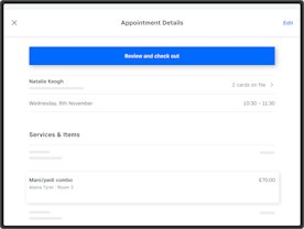 Check clients out from anywhere, take cash or cards, and set up prepayments. Standard processing fees apply.
