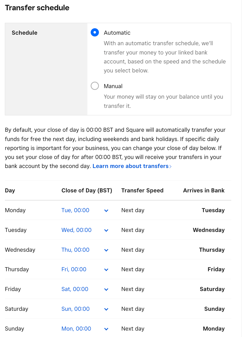 Square will automatically transfer your funds for free the next day, including weekends and bank holidays. Square groups and sends payments based on the time you choose to end your day. By default, your close of day is 00:00 BST but you can customise your close of day. If specific daily reporting is important for your business, you can change your close of day. If you set your close of day for after 00:00 BST, you will receive your transfers in your bank account by the second day.