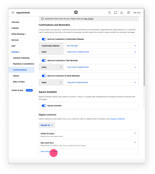 Sign in to Square Dashboard and go to Appointments > Settings > Communications.