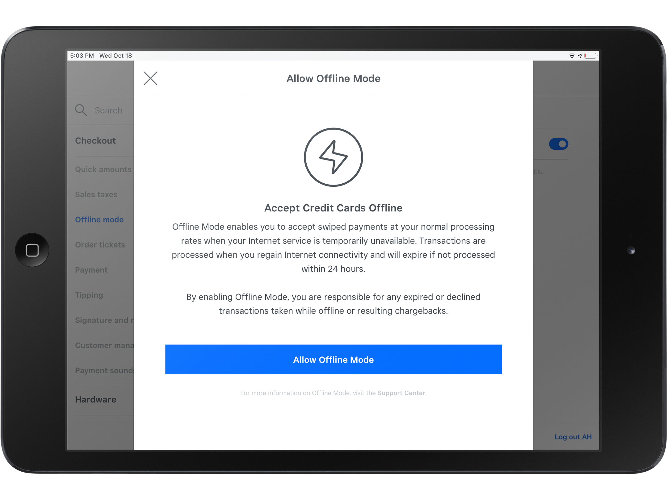Allow offline payments in advance to prepare for a network outage or Square service disruption.
