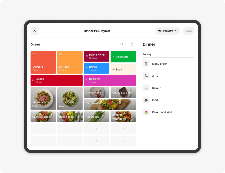- To add new items or menu groups, select a blank tile (indicated with a plus icon (+). You can also add existing items and menu groups, create new items or menu groups or add functions to your layout such as actions, discounts and service charges.
