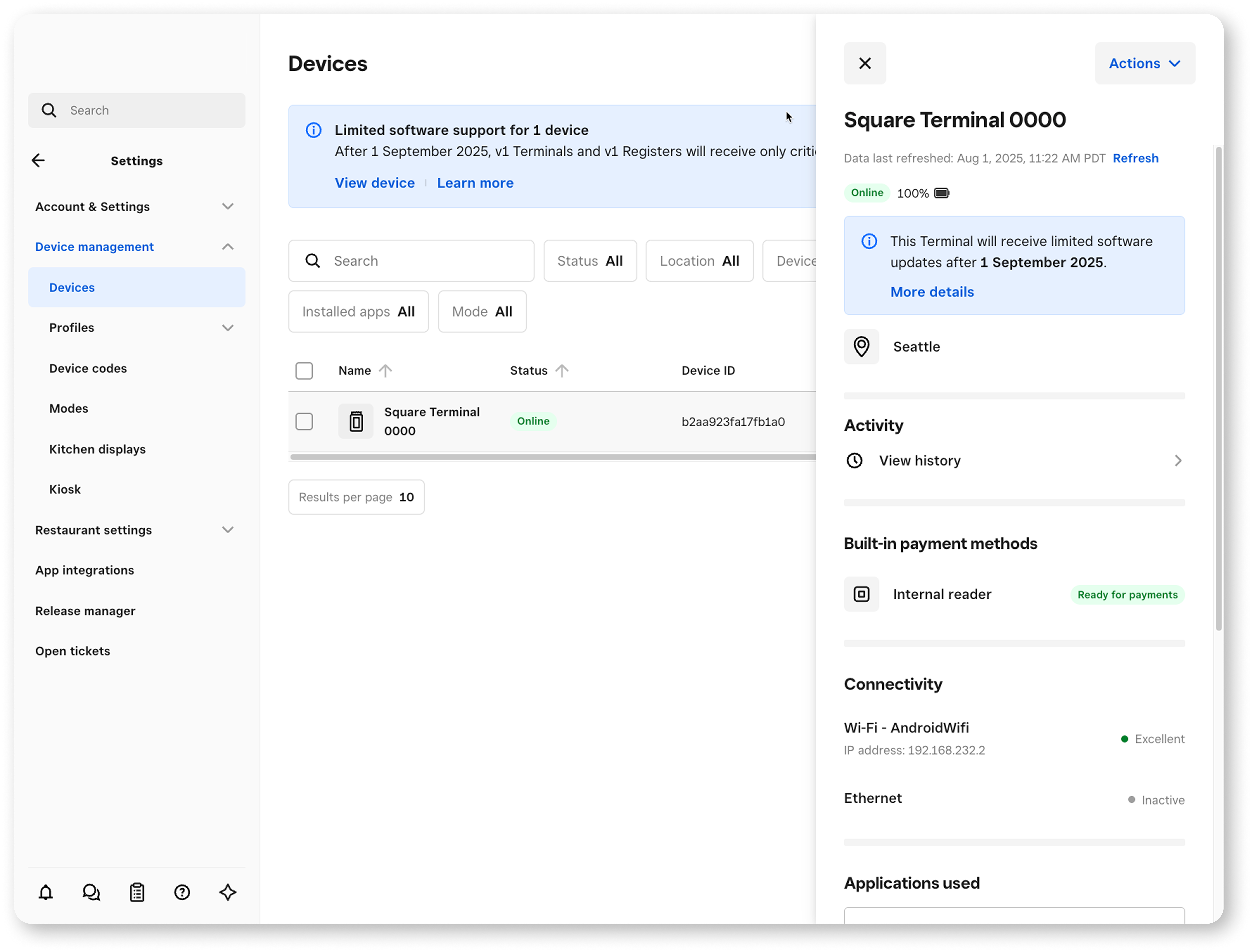 Image above: The device details page is expanded on the right side of the screen, as seen in the Square Dashboard.
