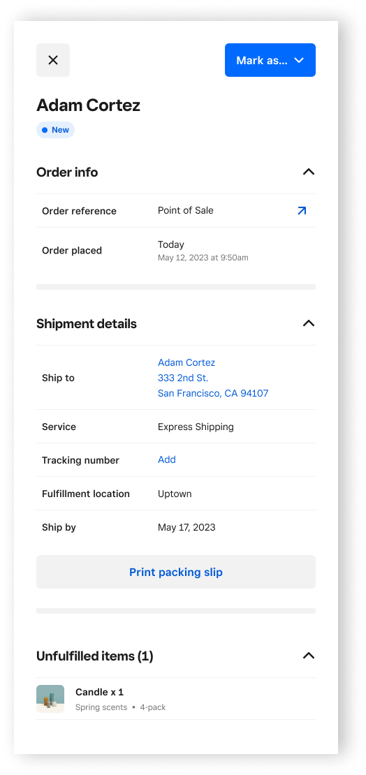 - Sélectionnez une commande à expédier et touchez ** > Marquer en cours** ou Commande expédiée.