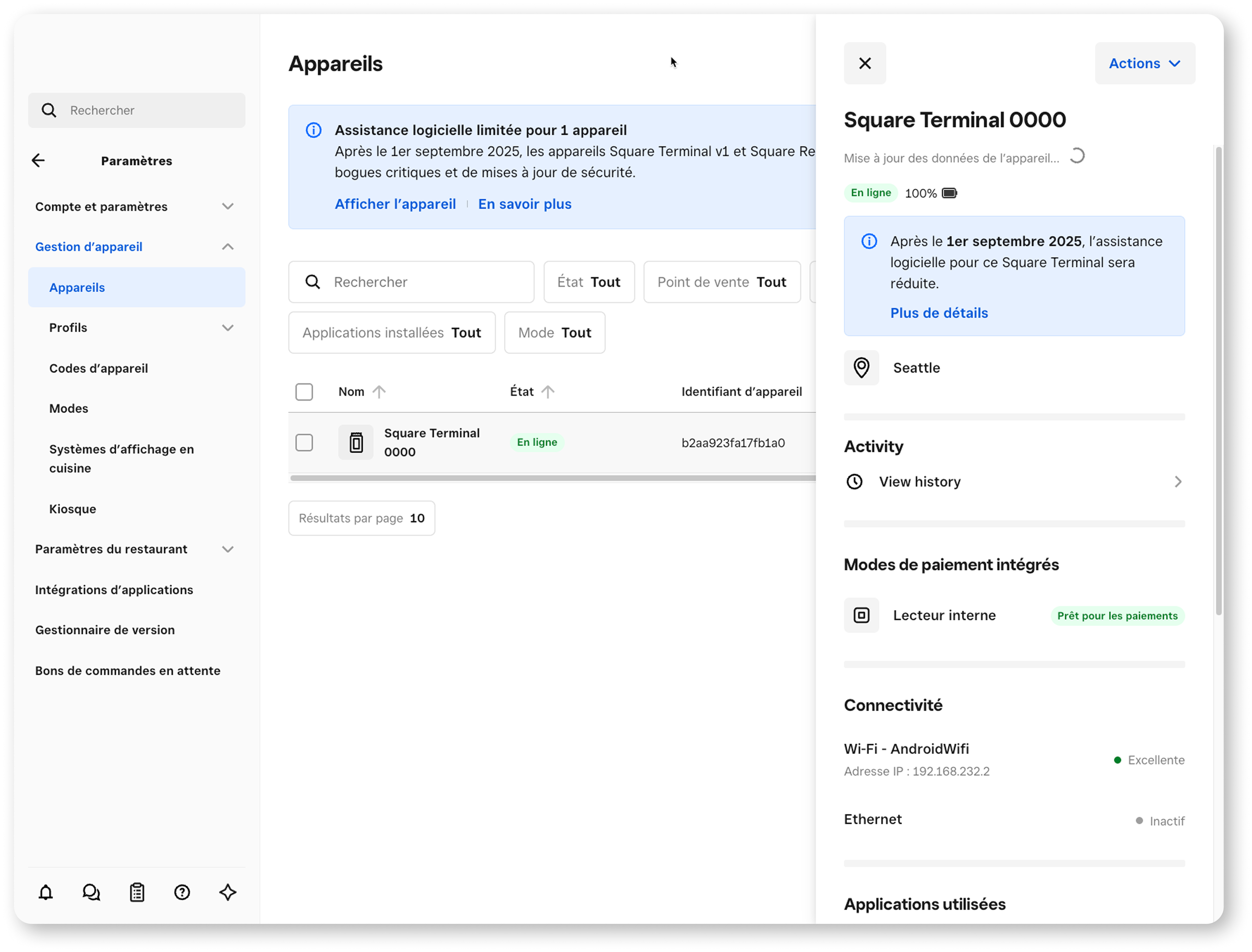 Depuis le 1er septembre 2025, les mises à jour logicielles ont été interrompues pour Square Terminal (1re génération, v1). Si vous avez reçu un courriel ou une alerte sur votre appareil Square Terminal (1re génération, v1) ou si vous avez été notifié dans le Tableau de bord Square, alors vous avez un appareil qui approche de sa fin de vie utile.