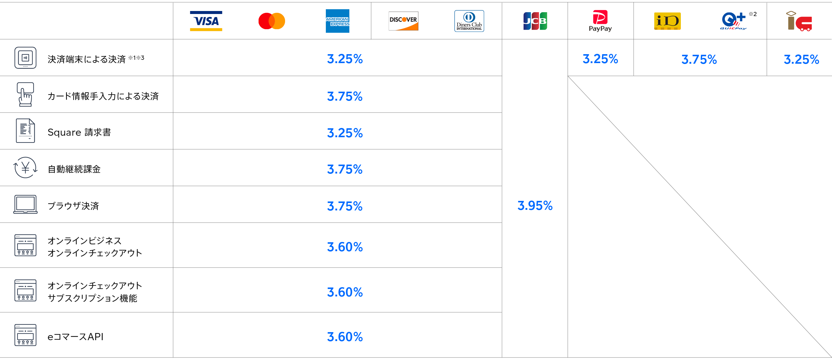 支払方法ごとのSquare手数料