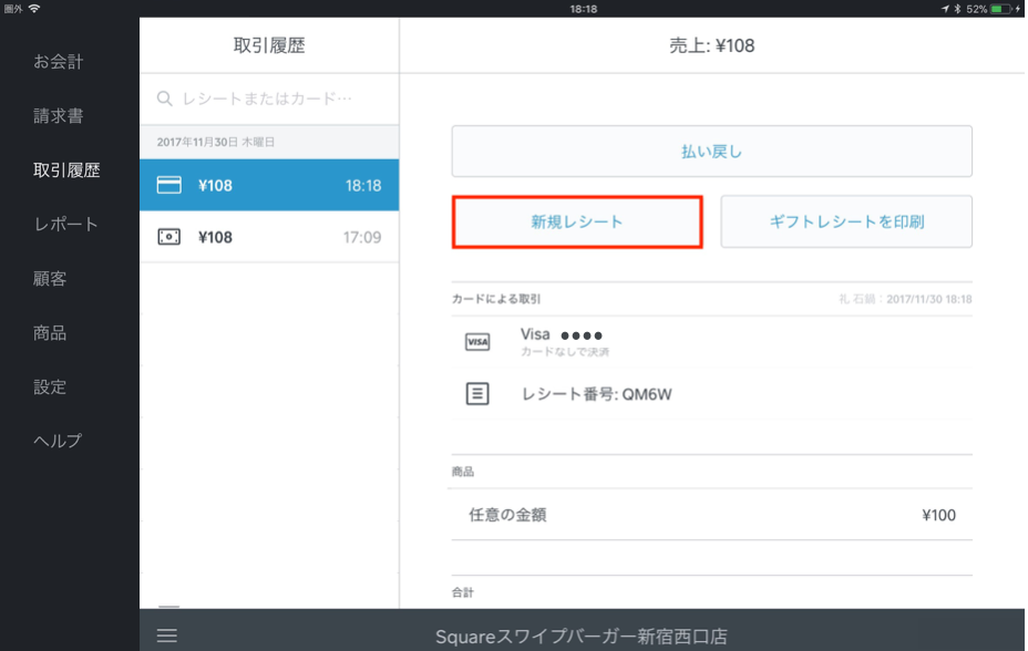 ご注意:Square レジスターのお客さま用の画面を使っている場合、またはSquare ターミナルをお客さま用の画面として使っている場合、領収書はお客さま用の画面からは印刷できないため、アプレットの取引履歴から印刷してください。