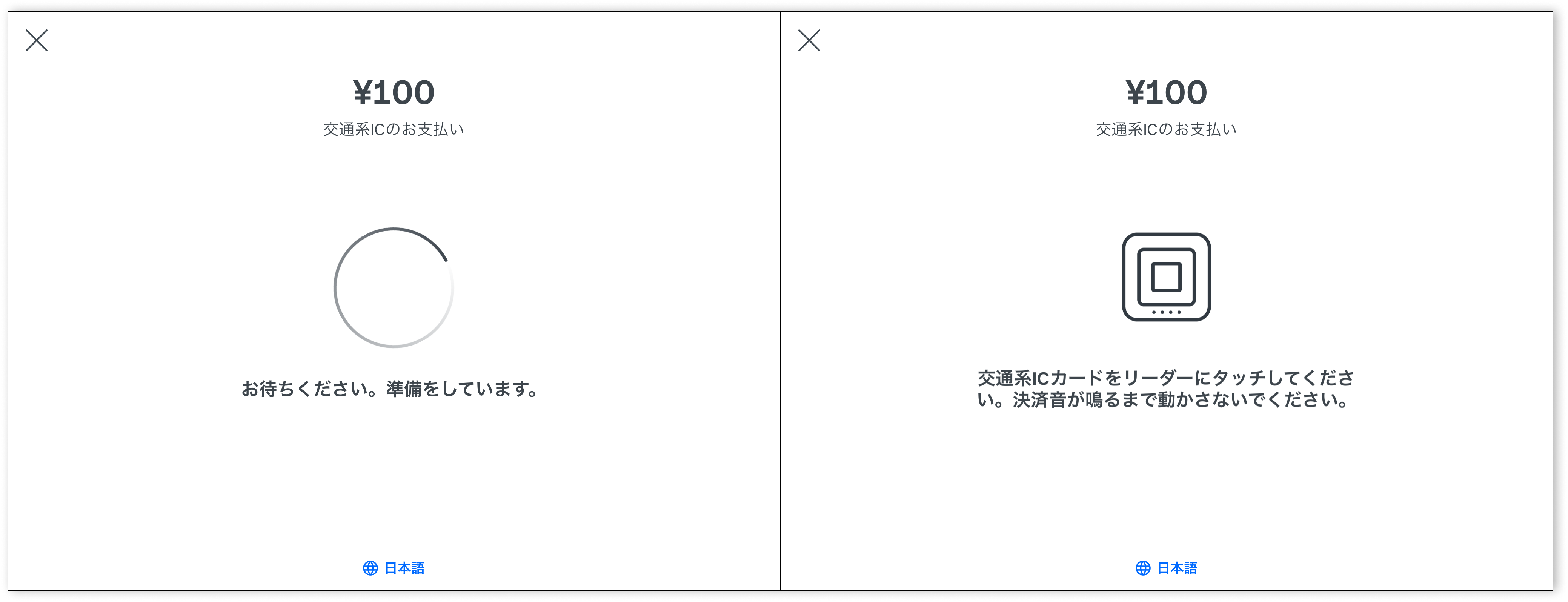 - Square レジスター、SquareターミナルまたはSquare スタンド(第2世代)をご利用の場合、ハードウェアの決済準備が完了するとタッチ決済アイコンが点滅します。