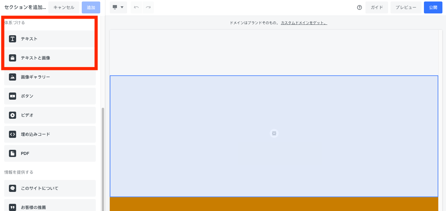 既存のセクションを選択するか、[+] > [セクション] の順に選択し、セクションの種類を選びます。