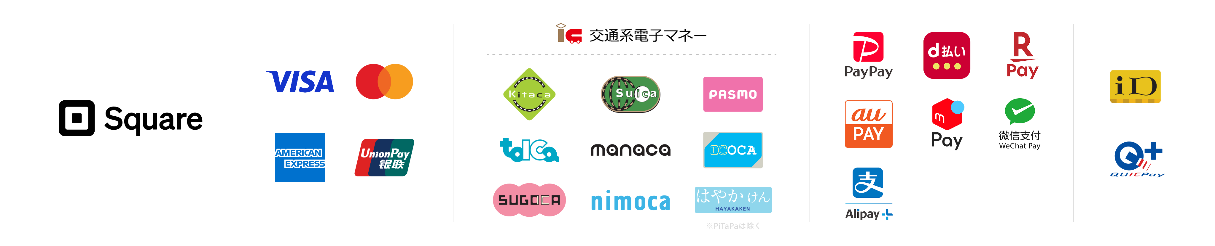 Visa、Mastercard、UnionPay(銀聯)のお取り扱いは、Squareでの審査に加え、三井住友カード株式会社による審査が必要です。アメリカン・エキスプレスカードのお取り扱いは、American Express International, Inc.による審査が必要です。JCB、Diners Club、Discoverカードのお取り扱いは、株式会社ジェーシービーによる審査が必要です。審査結果によっては、カード決済サービスまたは一部のカードブランドでの決済をご利用いただけない場合があります。