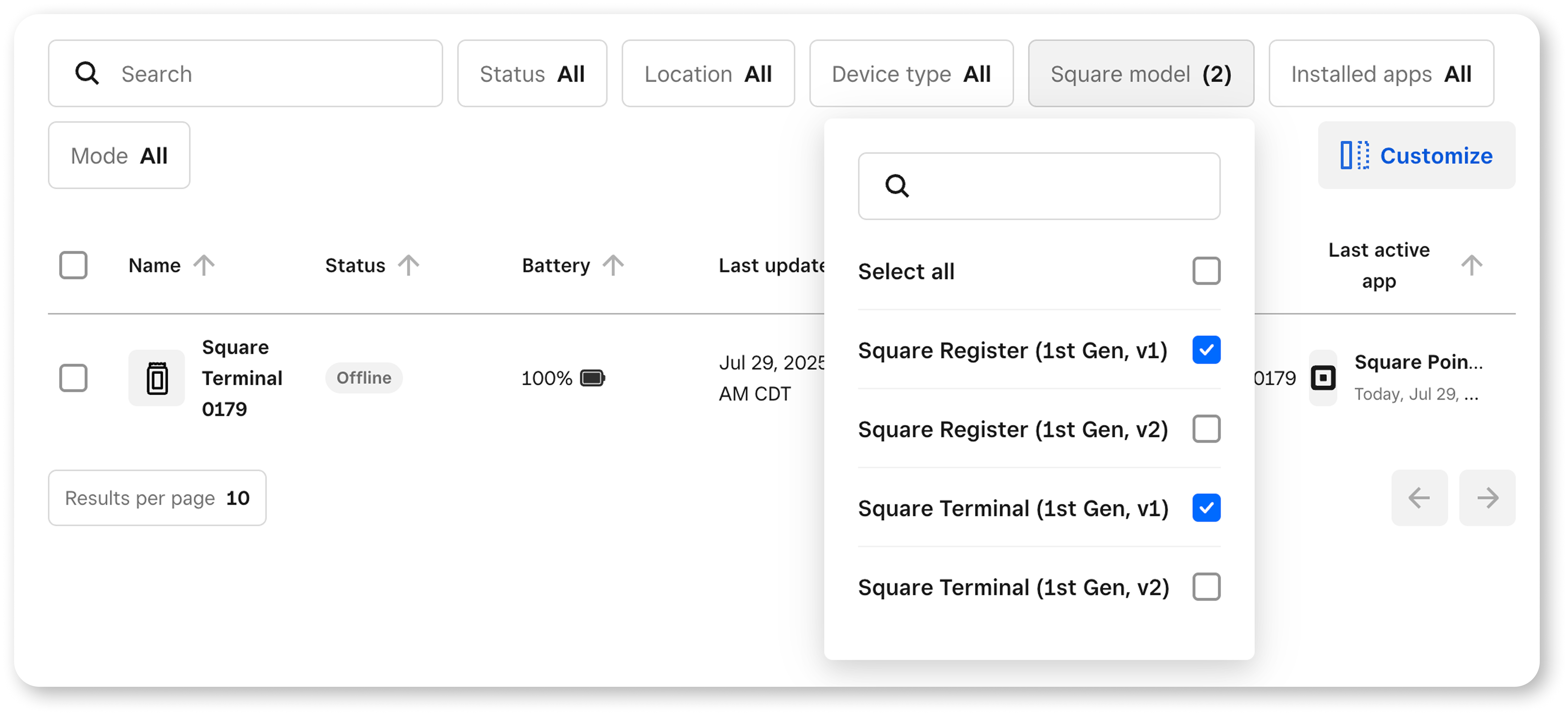 Image above: The device list is filtered by Square model type, as seen on the Square Dashboard.