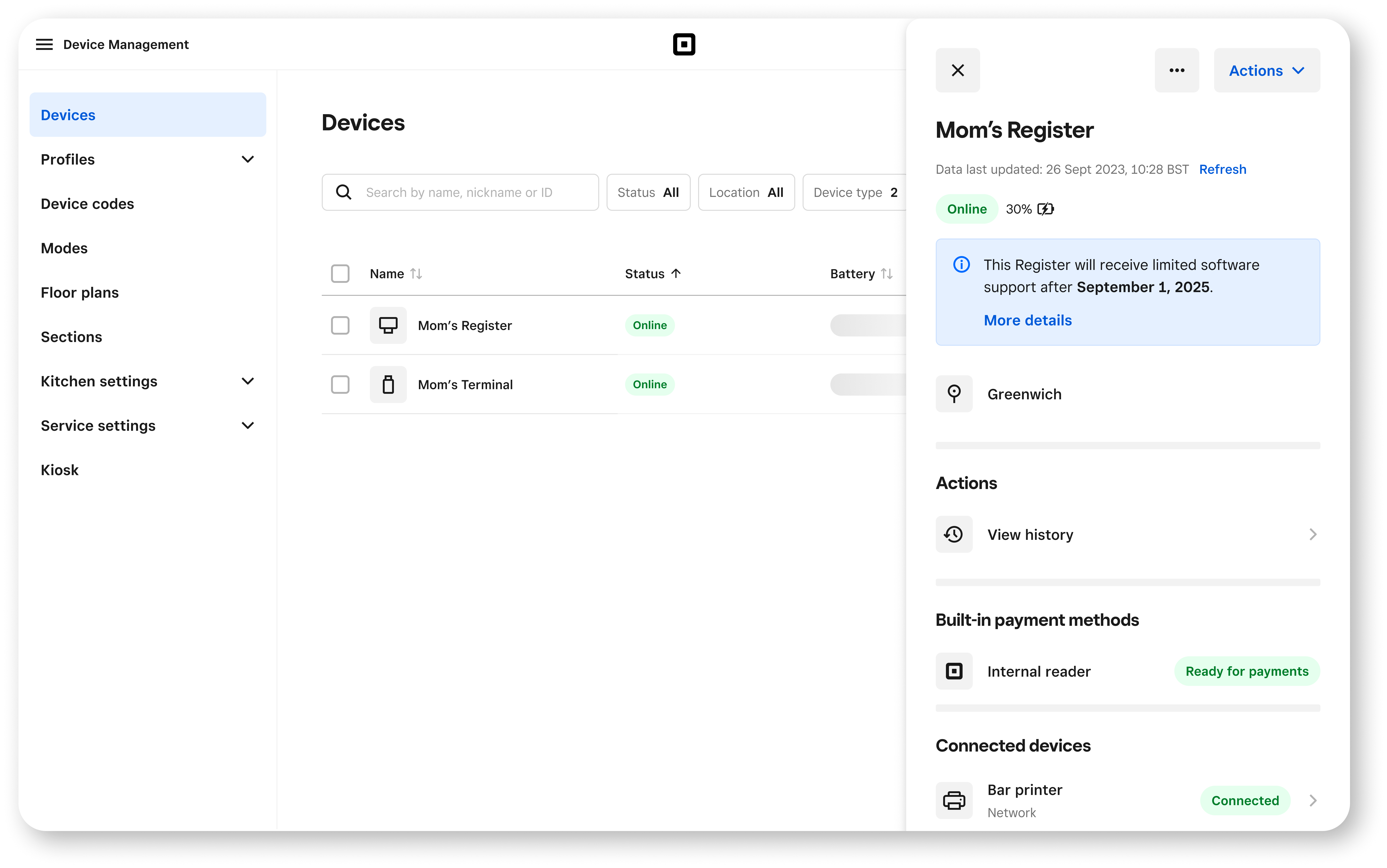 Image above: The device details page is expanded on the right side of the screen, as seen in the Square Dashboard.