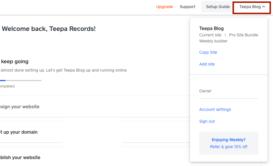 Every site you own or have access to has its own dashboard with information specific to that site. You can switch between your sites using the Site Switcher on the upper left side of your Dashboard. Clicking the name of the selected website will bring up a list of all your sites and sites shared with you. Selecting a different site from this list will update the dashboard information to reflect that site. To the right of the site name is the options menu (. . .) where you can choose to Copy or Delete the site.