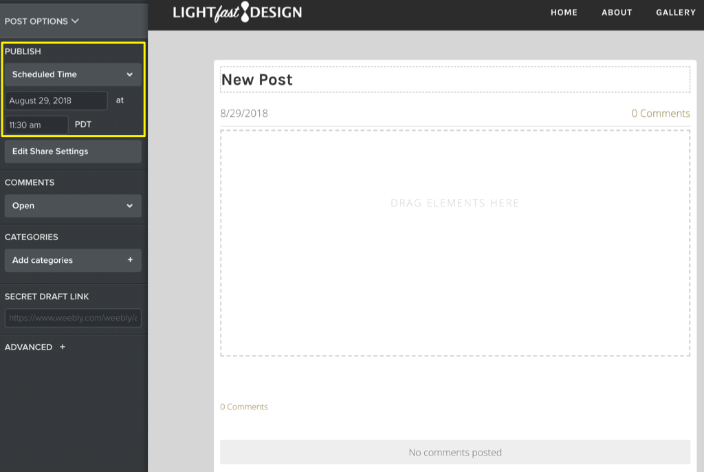 When you're working on a new post in the editor, click the Post Options button. This will open a sidebar where you can select the date and time you want the post to go live.