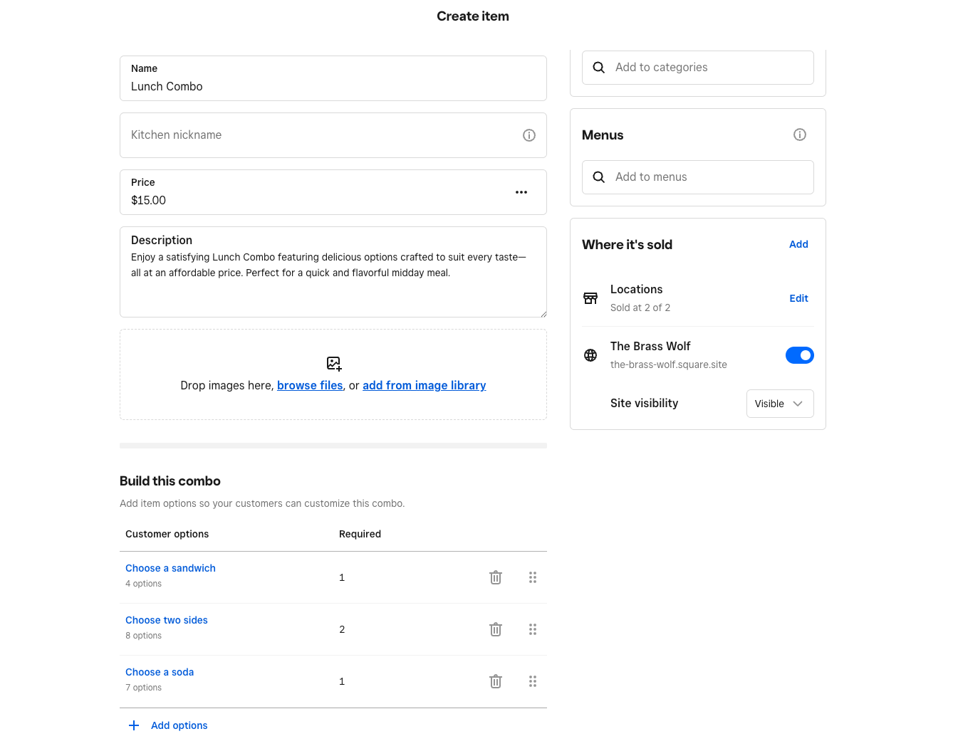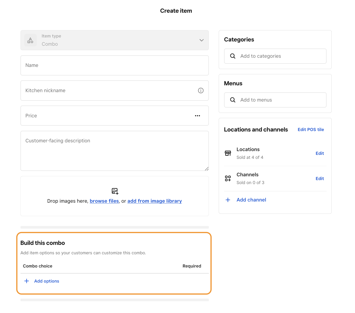 You can create combos using your existing items from your Square Dashboard. Before you set up combos, you need to create items. Learn how to create and edit items.