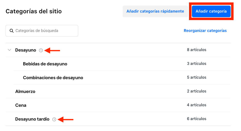 Puedes crear categorías por horarios para incluir artículos del menú que solo están disponibles durante ciertas horas o días (como desayuno, almuerzo, fines de semana, etc.). Estas categorías también se pueden aplicar a tus horarios de recolección y entrega local; es decir, que tus clientes solo podrán adquirir esos artículos durante el horario que especifiques (teniendo en cuenta los tiempos de preparación y los ajustes de tiempo estimado de entrega).
