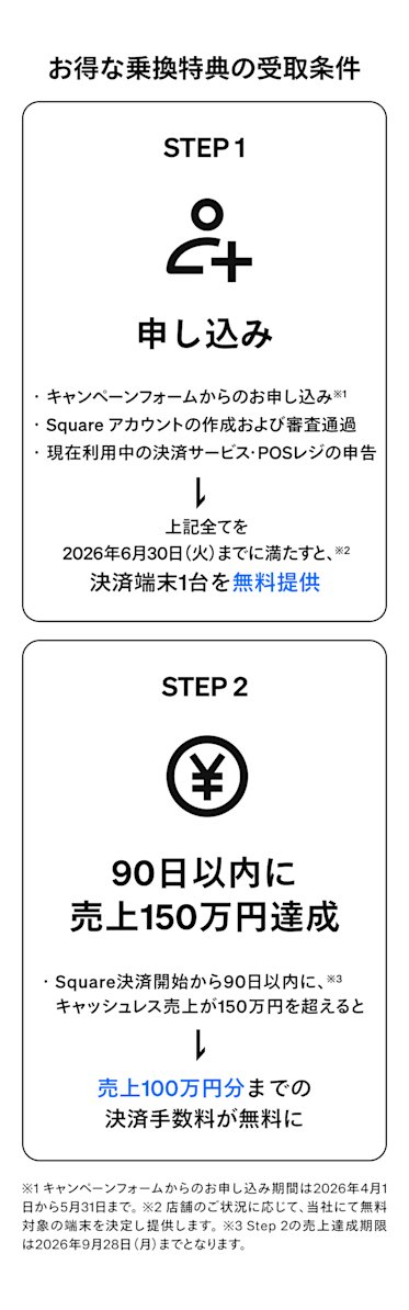 現在ご利用中の他社キャッシュレス決済サービスを申告すること→ 上記を満たした場合、Squareが選定する決済端末を1台無償で提供します。