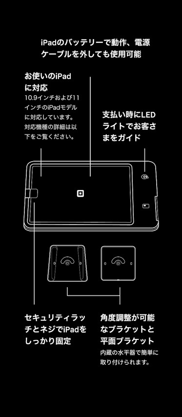 重さ | Square キオスク:710 g 重量にiPadや付属品は含まれません |
