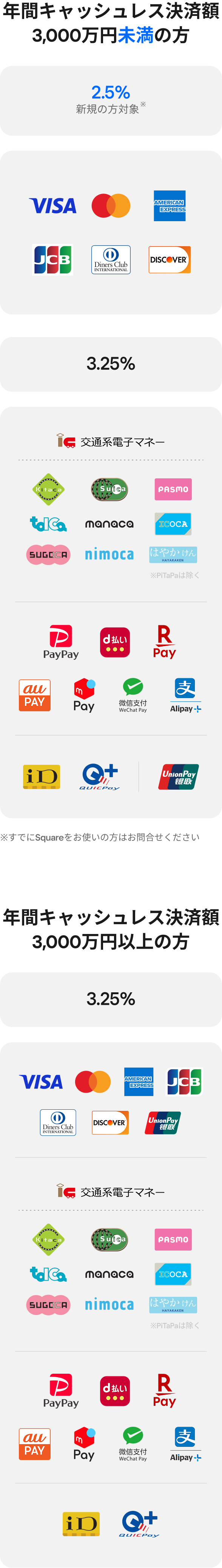 *年間キャッシュレス決済額3,000万円未満の方で、主要カードブランドによる対面決済の場合。それ以外の場合は3.25%〜あるいはカスタム手数料。