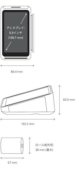 電源モード | Square ターミナルは、電源に接続して使用するか、1日中持続するよう設計されたバッテリーによって完全にワイヤレスで使用することも可能です。 |