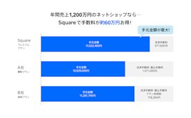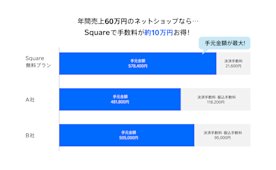 売上から決済手数料を含む諸々の手数料、月額利用料(*有料プランを利用した場合)を差し引いて、手元に入る金額を他社と比較してみると、Squareが断然お得です。下記の図では、年間売上が異なる3つのネットショップが年間支払う手数料・月額利用料を比較しています。